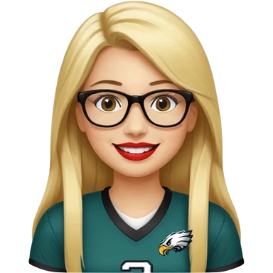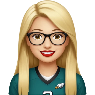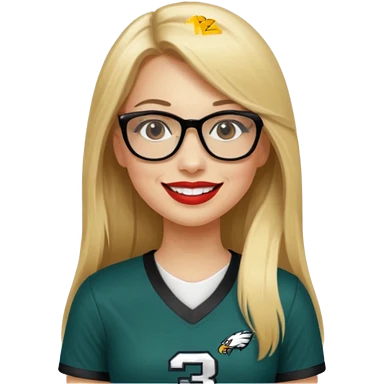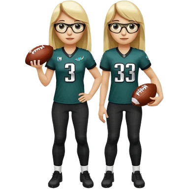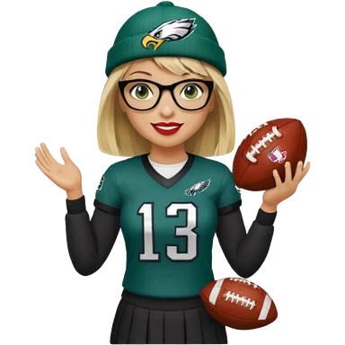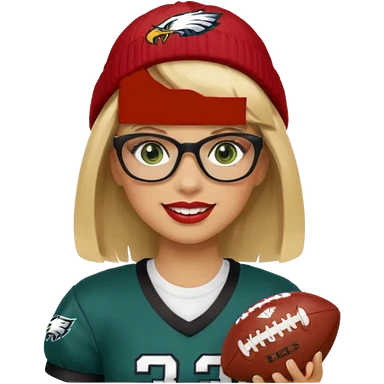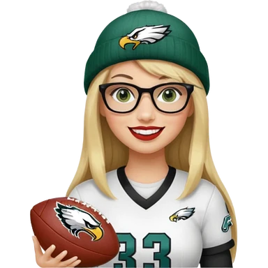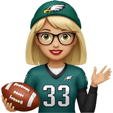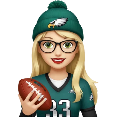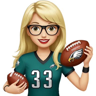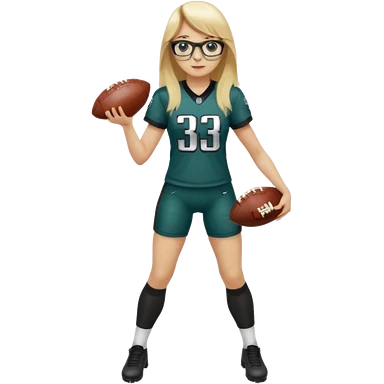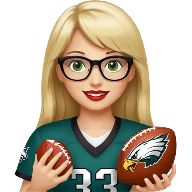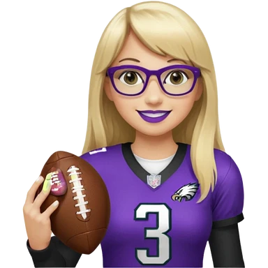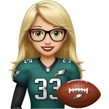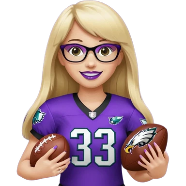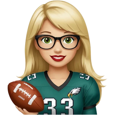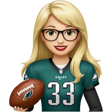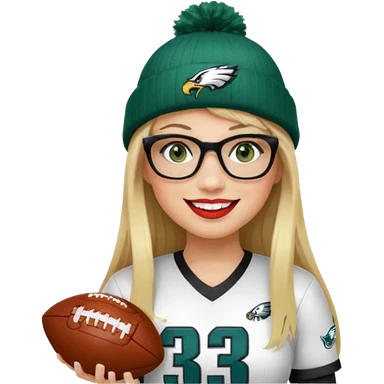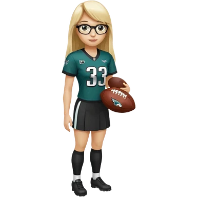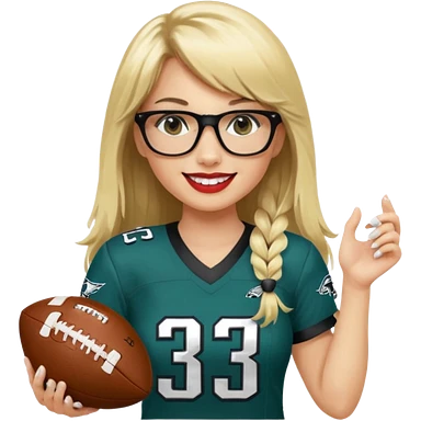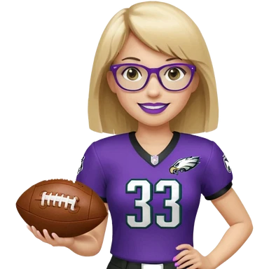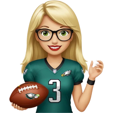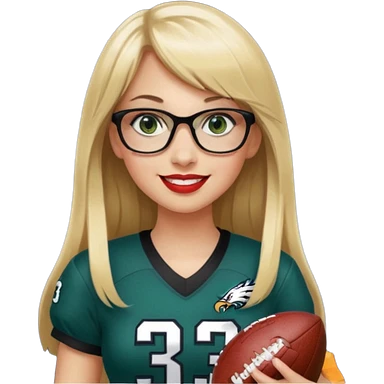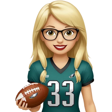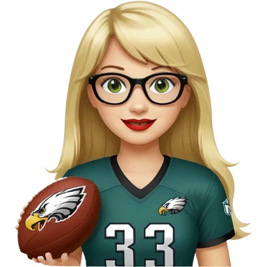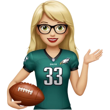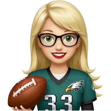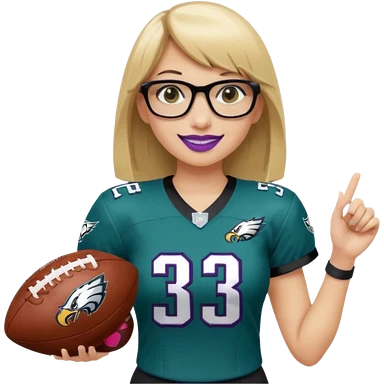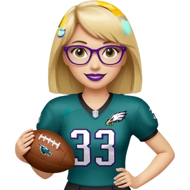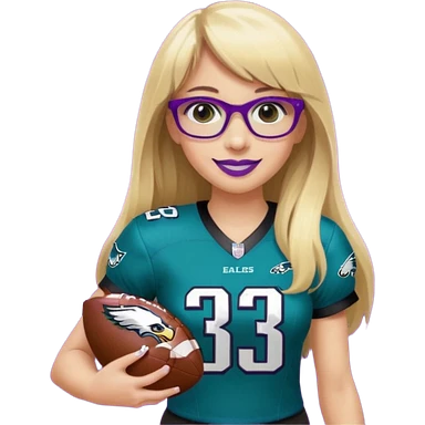 full length women wearing eagles uniform, long blonde hair, straight bangs, black glasses, holding football, number 33, smiling, purple lipstick emoji | AI Emoji Generator
