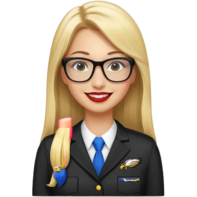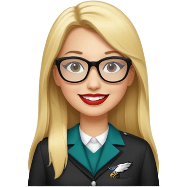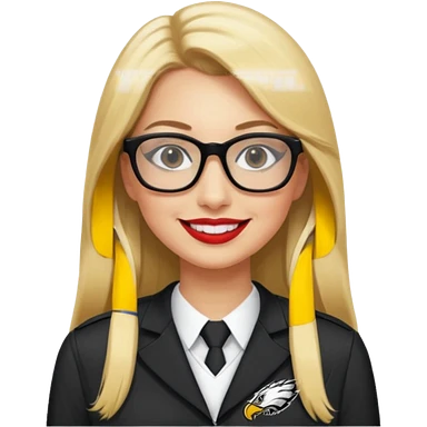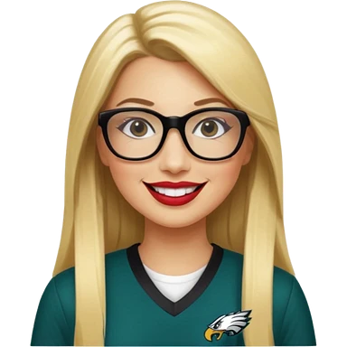 full length women wearing eagles uniform, long straight blonde hair, straight bangs, green eyes, black rectangle glasses, holding football, number 33, smiling, lipstick, eagles beanie emoji | AI Emoji Generator