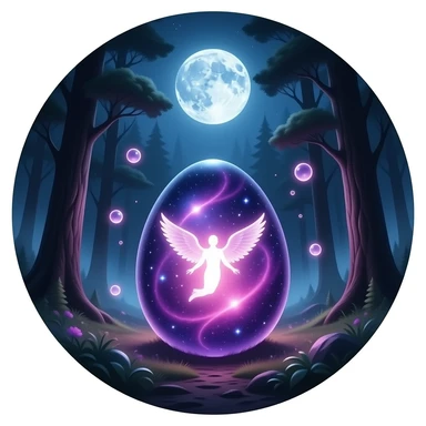 glowing cosmic egg in dark misty forest, filled with purple‑pink nebula and winged light‑spirit, surrounded by floating luminous orbs, full moon above, mystical fantasy atmosphere emoji