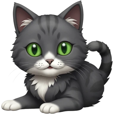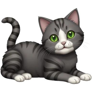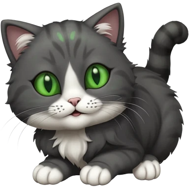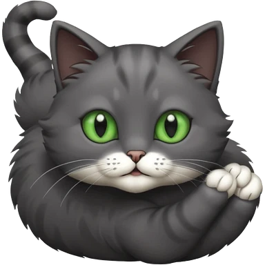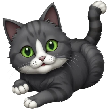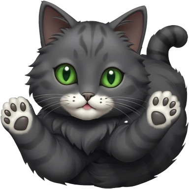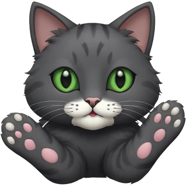 solid dark grey cat with green eyes, fully grey face, white toes/paws playfully rolling upside down emoji