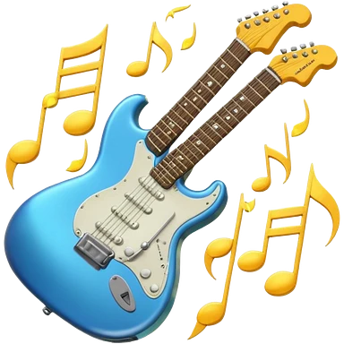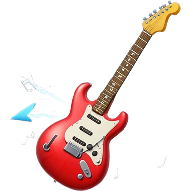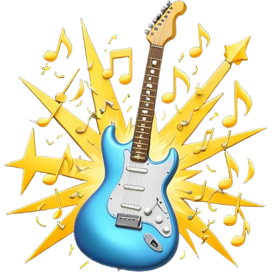 A 3D Apple-style emoji of a bold “ROCK” text written in shiny metallic letters, with an electric guitar leaning on the text, surrounded by small music notes and lightning bolts, energetic and powerful rock music vibe emoji