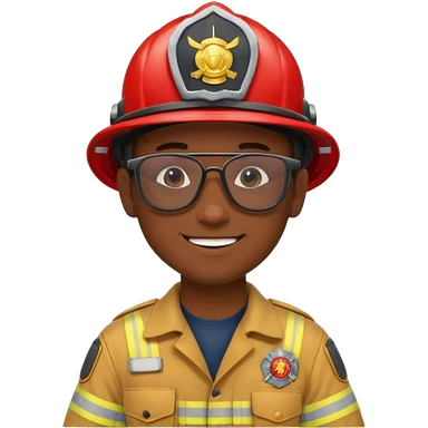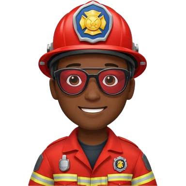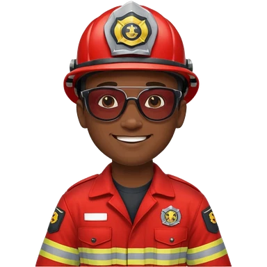 Young, male, dark skin, wearing sunglasses, firefighter uniform, happy emoji