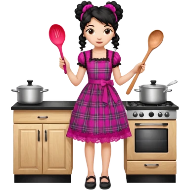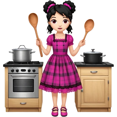 A beautiful girl wears a fuchsia lace dress with a plaid pattern. Her long, curly black hair is styled in a messy bun. She wears accessories and holds a wooden kitchen spoon. She is standing and wearing black shoes. The illustration style is clipart. emoji