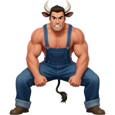 furious sunburnt country handsome extra large muscular man with large breasts with bull horns and cow ears and cow tail dressed in shabby ragged denim overalls squats legs vide open emoji