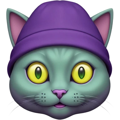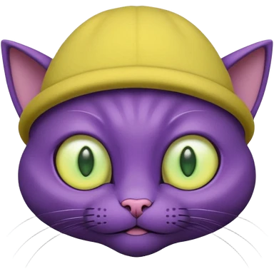 dark purple alien cat with no fur and yellow hat and green eyes emoji