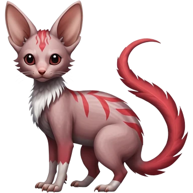 Furry, fluffy feathery scaly, Minccino-Sphynx-Lykoi-Linoone-Zangoose-fusion-hybrid-animal-Fakémon-creature, full body, thin long sleek scaly tail, intricate markings emoji