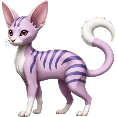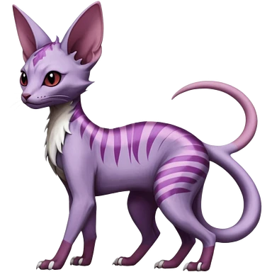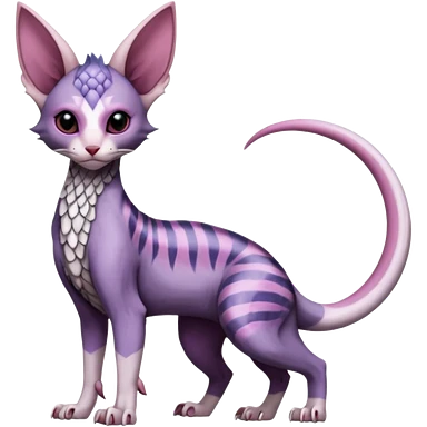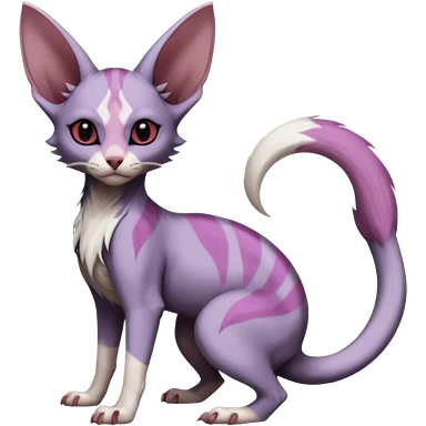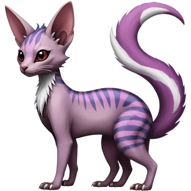 Furry, Purple, white, black, Minccino-Sphynx-Lykoi-Linoone-Zangoose-fusion-hybrid-animal-Fakémon-creature, full body, thin long sleek scaly tail, intricate markings emoji