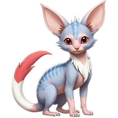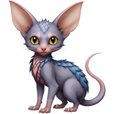 Furry, fluffy feathery scaly, Minccino-Sphynx-Lykoi-Bat-fusion-hybrid-animal-Fakémon-creature, full body, thin long sleek scaly tail, intricate markings emoji