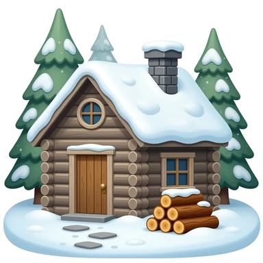 Greyish brownish winter cabin with wood logs laying outside emoji