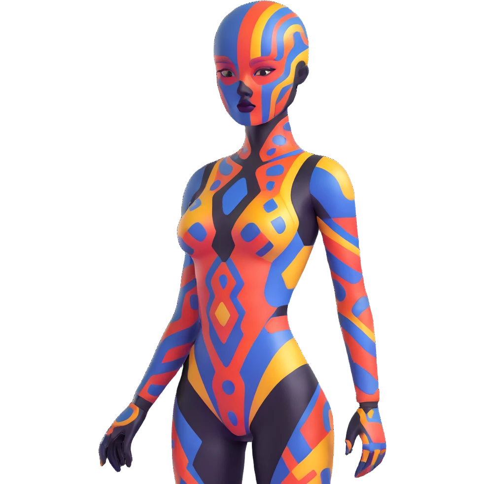 Futuristic figure with colorful skin patterns