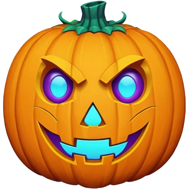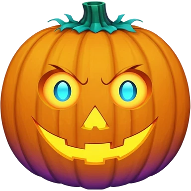 A futuristic glowing jack-o'-lantern face emoji, purple and cyan colors only, dark background emoji