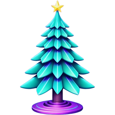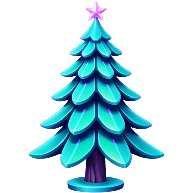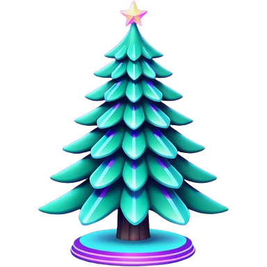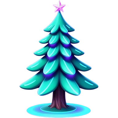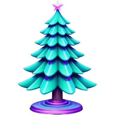 Futuristic glowing Christmas tree emoji with neon decorations, purple and cyan holographic glow, dark background, festive sparkles, no face. emoji