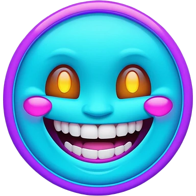 futuristic glowing emoji face laughing wide with glowing teeth, purple and cyan neon light, dark background emoji
