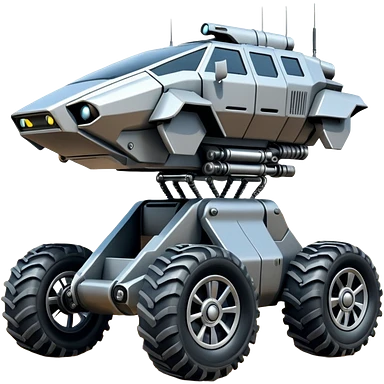 Futuristic jumping four-legged armored canine sporty self-balancing massive mech trail assault vehicle motor-in-wheel side-hill leaning actively robotically articulating hydraulic independent suspended pod gimbal defender antique off-road racing rover with large fast engine basher crawler megatron emoji