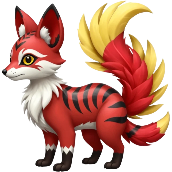 Futuristic sanguine-red banana-yellow black chevron-marked furry fluffy floofy feathery tribal marked Genet-Absol-Kyurem-Zeraora-Primagen-fusion-creature emoji