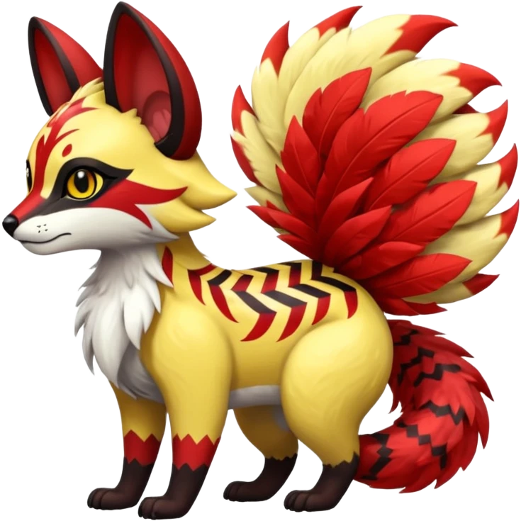 Futuristic sanguine-red banana-yellow black chevron-marked furry fluffy floofy feathery tribal marked Genet-Absol-Kyurem-Zeraora-Primagen-fusion-creature emoji