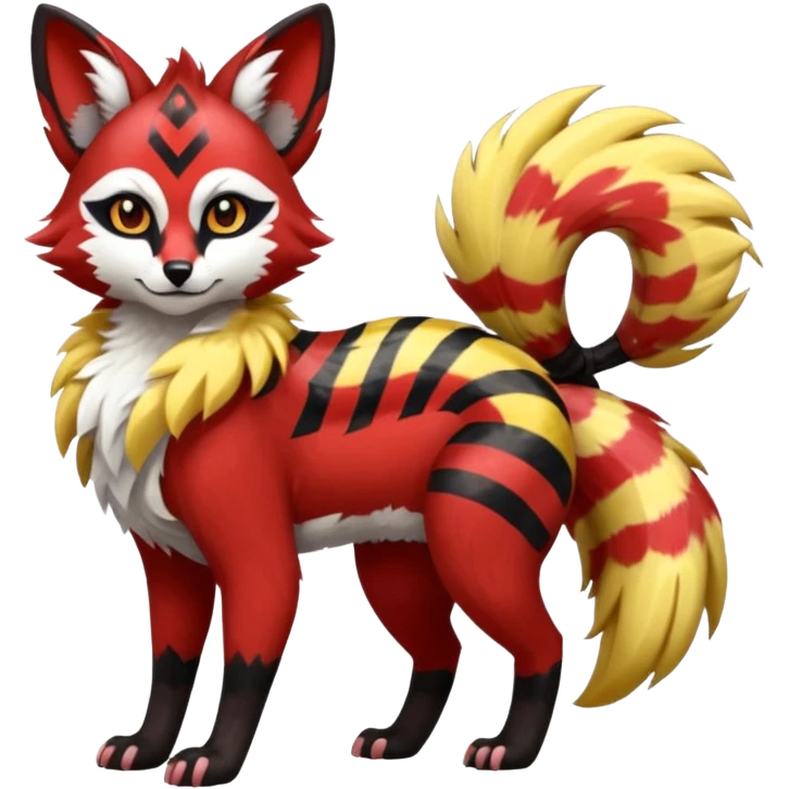 Futuristic sanguine-red banana-yellow black chevron-marked furry fluffy floofy feathery tribal marked Genet-Absol-Kyurem-Zeraora-Primagen-fusion-creature emoji