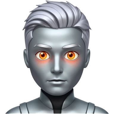 Futuristic human with metallic cybernetic enhancements, digital interface on face, holographic display emoji