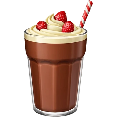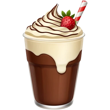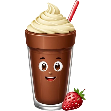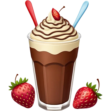 Un vaso cubierto de chocolate que arriba se vea crema batida varias fresas y mym emoji