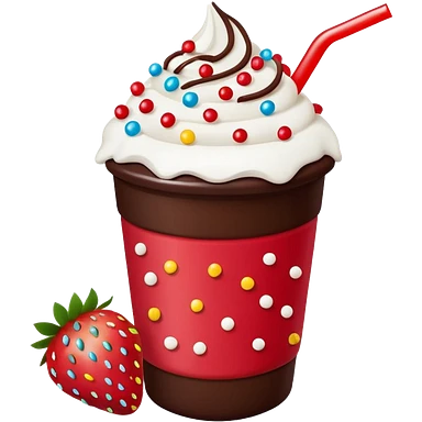 Un vaso plástico cubierto de chocolate que arriba se vea crema batida que por encima se vean fresas y chispas de colores emoji