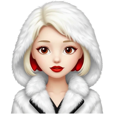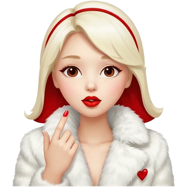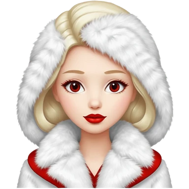 A beautiful, cute girl with red lipstick is posing for a photo in a white fur coat emoji