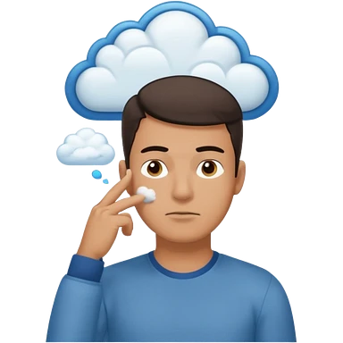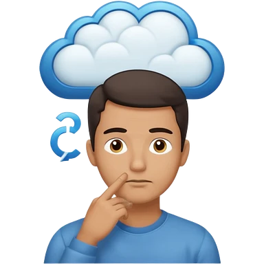 Casually dressed man with one hand on his chin, eyebrows slightly furrowed. A thinking cloud floats above his head containing a critical-thinking symbol (like a question mark, magnifying glass, or logic icon). Realistic emoji aesthetic, clean-shaven, soft neutral background emoji