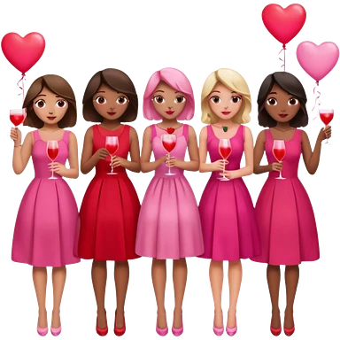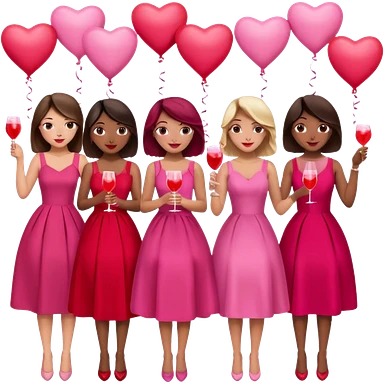 galentines party : they wea red and pink dresses, hold pink and red heart balloons and pink cocktails in their hands, there is a blond girl, a brunette, an asian, and a brown skin girl emoji