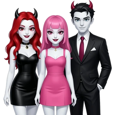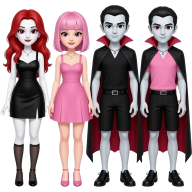 Vampiro femmina con pelle bianca e capelli rossi indossa un vestito corto neri insieme alla sua amica VAMPIRO con i capelli rosa e frangia che indossa un vestito corto rosa e la pelle bianca insieme ai loro reciproci fidanzati VAMPIRI con la pelle bianca vestiti abbinati alle fidanzate emoji