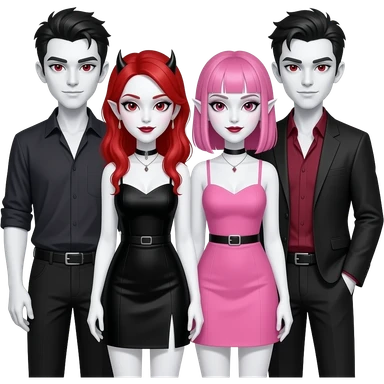 Vampiro femmina ADOLESCENTE con pelle bianca e capelli rossi indossa un vestito corto neri insieme alla sua amica VAMPIRO con i capelli rosa e frangia che indossa un vestito corto rosa e la pelle bianca insieme ai loro reciproci 2 fidanzati VAMPIRI con la pelle bianca vestiti diversamente emoji