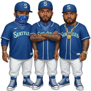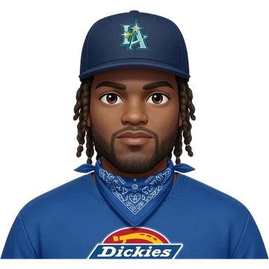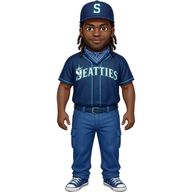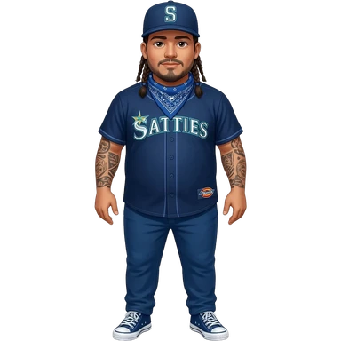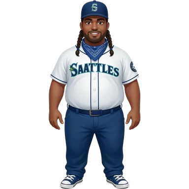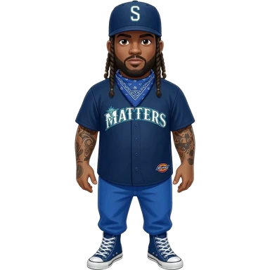 Fat Crip with braids a Seattle Mariners "S" hat blue bandana around neck with blue dickies pants and blue converse all star shoe and blue Seattle Mariners jersey emoji