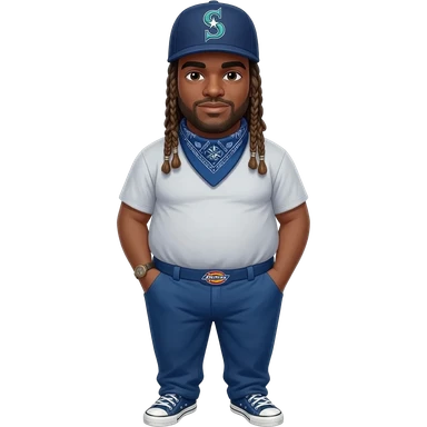 Fat Crip with braids a Seattle Mariners "S" hat blue bandana around neck with blue dickies pants and blue converse all star shoe Seattle Mariners jersey emoji