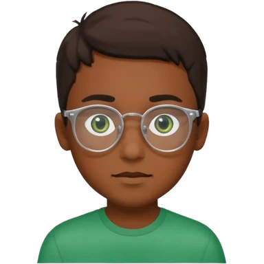 Garçon brun avec une coupe casquette, des cheveux bouclés, des yeux verts foncés et des lunettes rectangulaires transparentes emoji