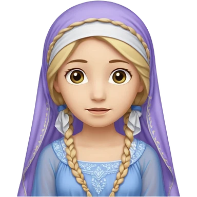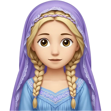 mujer, Joven, de aspecto dulce y elegante. Piel clara, ojos grandes y expresivos, sonrisa triste. Rubio o castaño claro, largo, con trenzas o velo. Vestido largo de tonos suaves (blanco, azul o lavanda), con bordados dorados; toca fina cubriendo la cabeza. cuerpo entero emoji