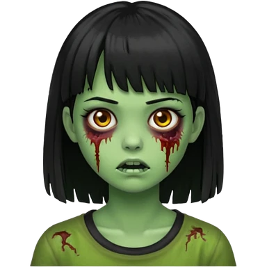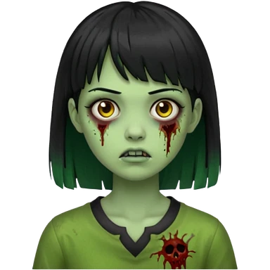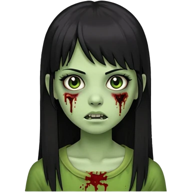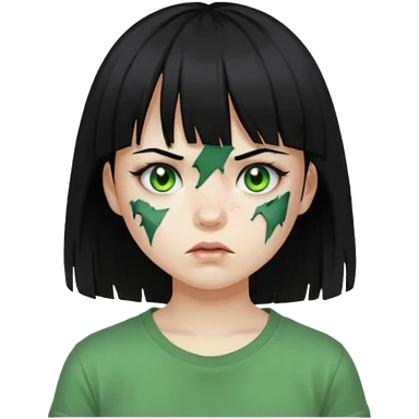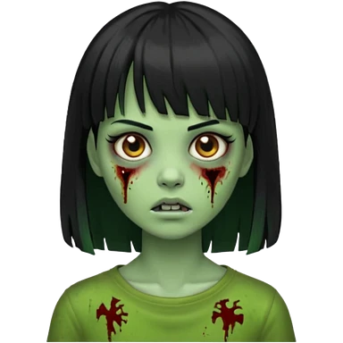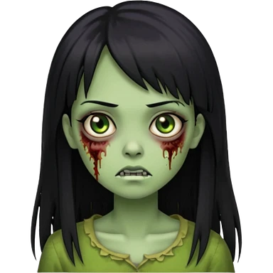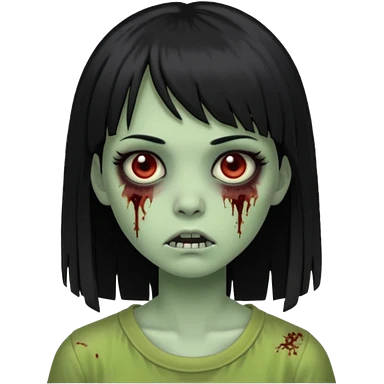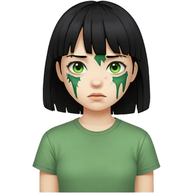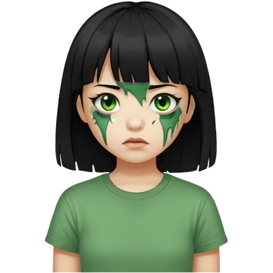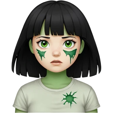 Garota de cabelo longo e preto com franja com a pele esverdeada e ferimentos expostos cobertos com sangue, usa uma camiseta branca rasgada e suja de poeira emoji | AI Emoji Generator