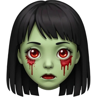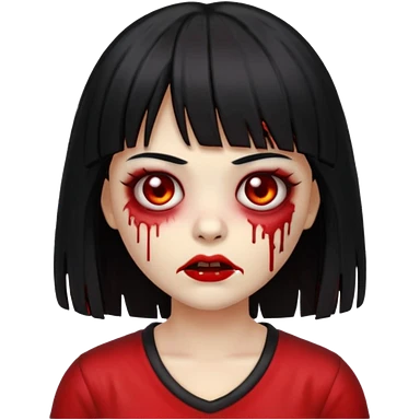 Garota zumbi com cabelo todo preto liso longo e mechas vermelhas na lateral da cabeça dos dois lados, usando uma blusa com um lado da manga caida preta emoji | AI Emoji Generator