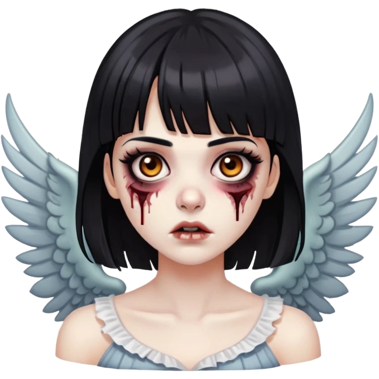 Garota zumbi com olhos castanhos e cabelo preto com franja na testa. Cílios compridos e delineador puxadinho. emoji | AI Emoji Generator