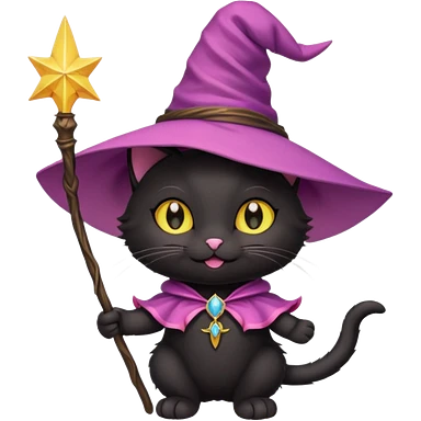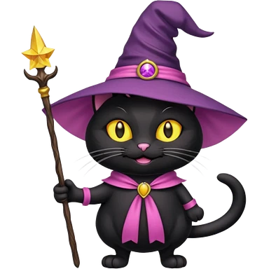 Gotito negro con ojos amarillo sonriendo feliz con los bigotes largos y disfraz de bruja de color rosa el disfraz con varita emoji