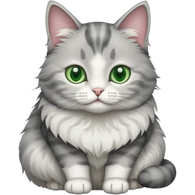 Emojis de una chica de pelo castaño largo sujetando un gatito gordo peludo mainecoon de colores gris negro y marrón emoji