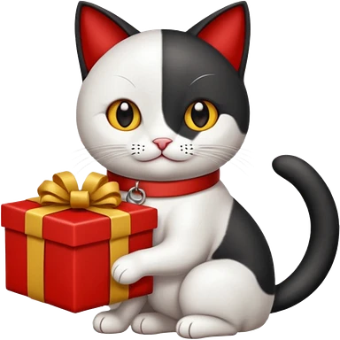 Gato negro con blanco feliz con moño rojo y un regalo 🎁 emoji