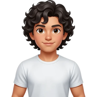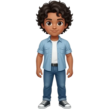 Hazme un chico con pelo un poco mas que por los hombros, rizado y negro, ojos marrones. Y que este un poco musculoso. Que tenga camiseta. QUE SE VEA EL CUERPO ENTERO Y QUE TENGA ZAPATOS emoji