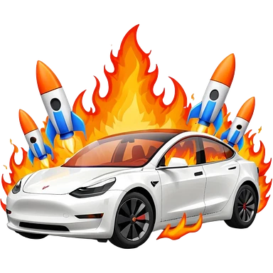 Tesla model 3 white. Two rockets mounted on roof flame backwards emoji