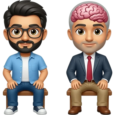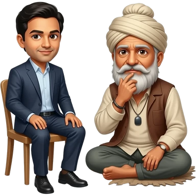 Make an emoji where Gaurav Goyal is sitting on a chair and Hemanta biswa Sharma is behaving like a mental and also dressed like a vikari Bhikari or mental emoji