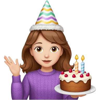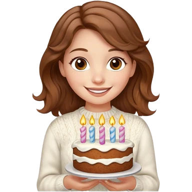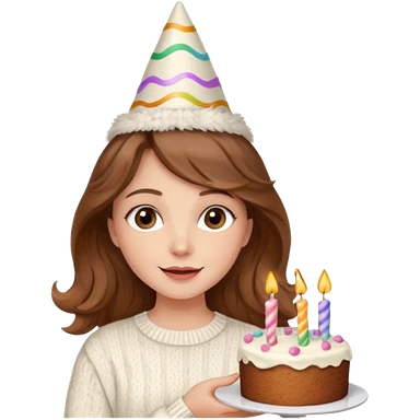 A pretty white girl with hazel brown eyes and brown wavy hair in a cosy white knit sweater, she is celebrating her birthday emoji
