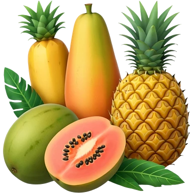Fresh tropical fruits flatlay (papaya, mango, pineapple) with pastel tones. emoji