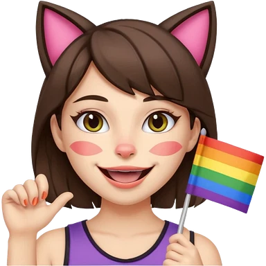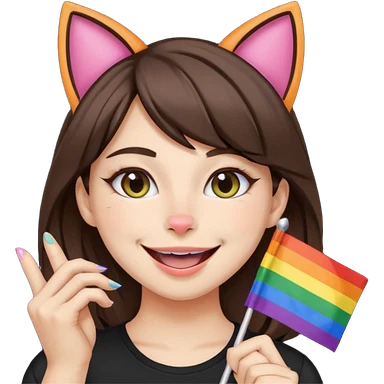 brunette girl with cat ears and doing cat pose with gay flag in mouth emoji