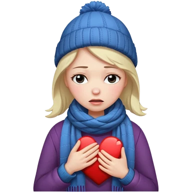 woman broken hearted, looking down sad, about to cry. holding her heart breaking, wearing a winter outfit emoji