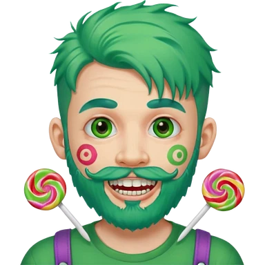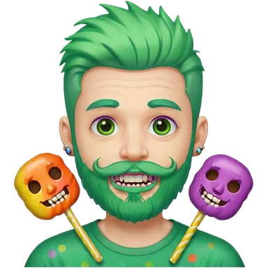 very colorful puffy green haired man just beard no mustache made out of candy wearing teeth-braces and excessive face tattoos just face emoji