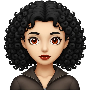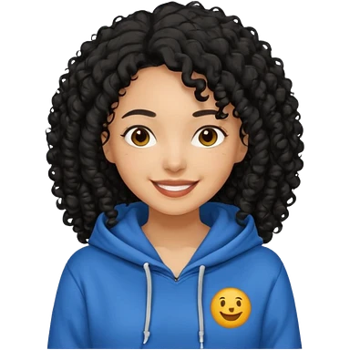A women with a black curly hair who wear a hoodie and that hoodie have a some smorf emoji