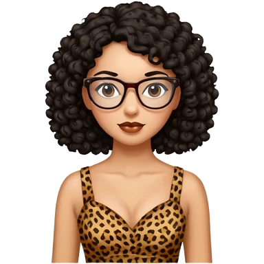 A women who wears glasses with a black curly hair, in a leopard print dress sweetheart neckline emoji