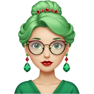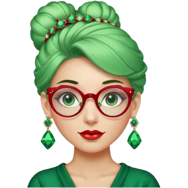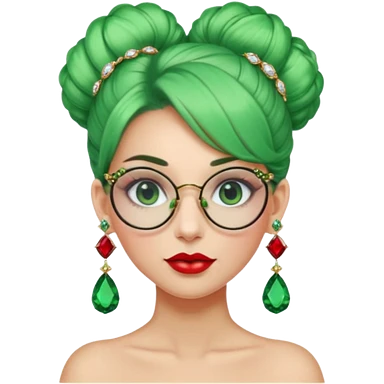 gem lover woman with gem accessories excessive amount gem glassess very big gem earrings green bun hair and red diamonds emoji
